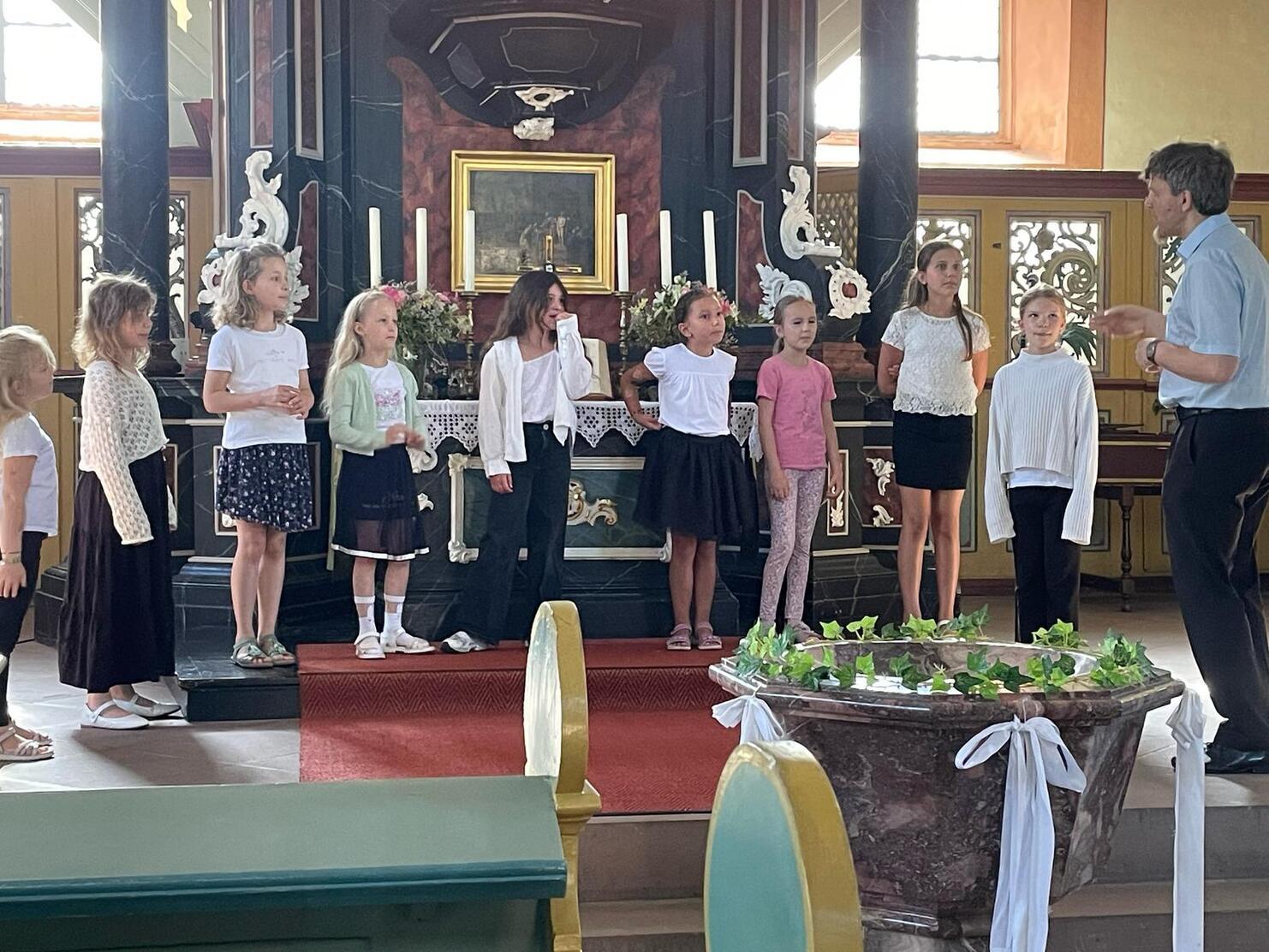 Dabei singen wir ganz "klassische" Kinderlieder wie auch Kinderlieder aus Jazz und Pop sowie fremdsprachige Lieder. Jährlich sind etwa vier Auftritte geplant; 2025 waren das Ostermontag, ein Gottesdienst vor den Sommerferien und ein Auftritt beim Gemeindefest. Ein weiterer Auftritt bei einem Gottesdienst im November ist geplant. In der Weihnachtszeit bilden der Kinderchor und weitere Kinder den Engelchor für das Krippenspiel. Neue Kinder sind sehr herzlich eingeladen. Grundvoraussetzungen gibt es keine; es geht nur um das gemeinsame Singen, Musizieren und Spaß haben. Bei Interesse melden Sie sich gerne bei Clemens Bosselmann.