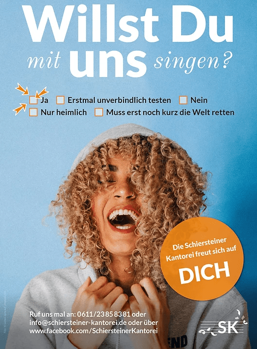 Die Proben der Schierstein Kantorei finden immer mittwochs von 19.30 bis 22 Uhr im Saal des Christophorushauses (Bernhard-Schwarz-Str. 25) am Schiersteiner Hafen statt.