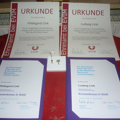 „Zur Ehre Gottes haben sie sich in den Dienst am Menschen nehmen lassen.“ ist auf Ihrer Ehrenurkunde zu lesen. Zutreffender könnte man das langjährige Wirken der beiden Gemeindeglieder wohl nicht beschreiben. Hildegard und Ludwig Link wurden im Rahmen des Gottesdienstes an Heiligabend 2022 im Jan-Niemöller-Haus verabschiedet, nachdem sie dort in den letzten neunzehn Jahren ehrenamtlich tätig waren. Sie wurden dabei mit dem Kronenkreuz in Gold ausgezeichnet.